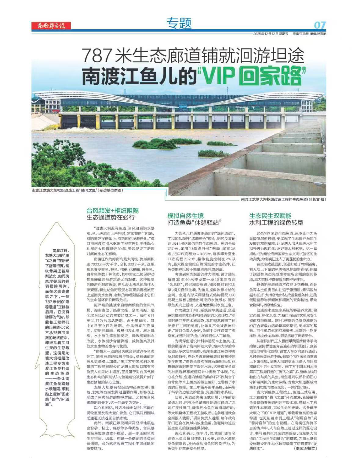 南國都市報:787米生態廊道鋪就洄游坦途 南渡江魚兒的“VIP回家路” |
